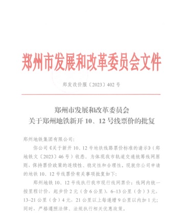 鄭州市發(fā)展和改革委員會關(guān)于鄭州地鐵新開10、12號線票價的批復(fù)